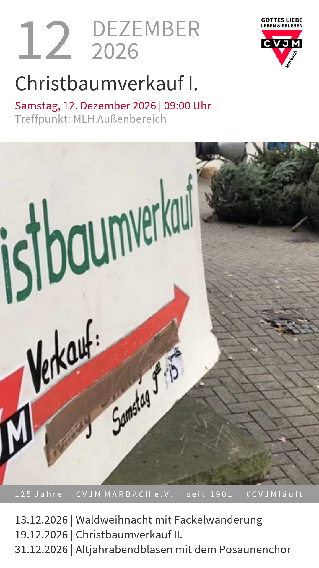 Christbaumverkauf I. am Samstag, den 12.12.2026 um 09:00 Uhr. Die Veranstaltung findet hier statt: MLH Außenbereich.