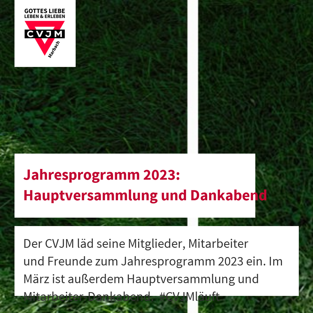 Zur jährlichen Hauptversammlung am Sonntag, 26. März 2023 ab 19 Uhr bittet der Vorstand des CVJM Marbach freundlich um zahlreiches Erscheinen. Ab 19:00 Uhr starten wir mit einem gemeinsamen Essen, der offizielle Beginn ist um 19:30 Uhr. Die Mitglieder des CVJM sollten bereits eine Einladung mit den Tagesordnungspunkten erhalten haben.