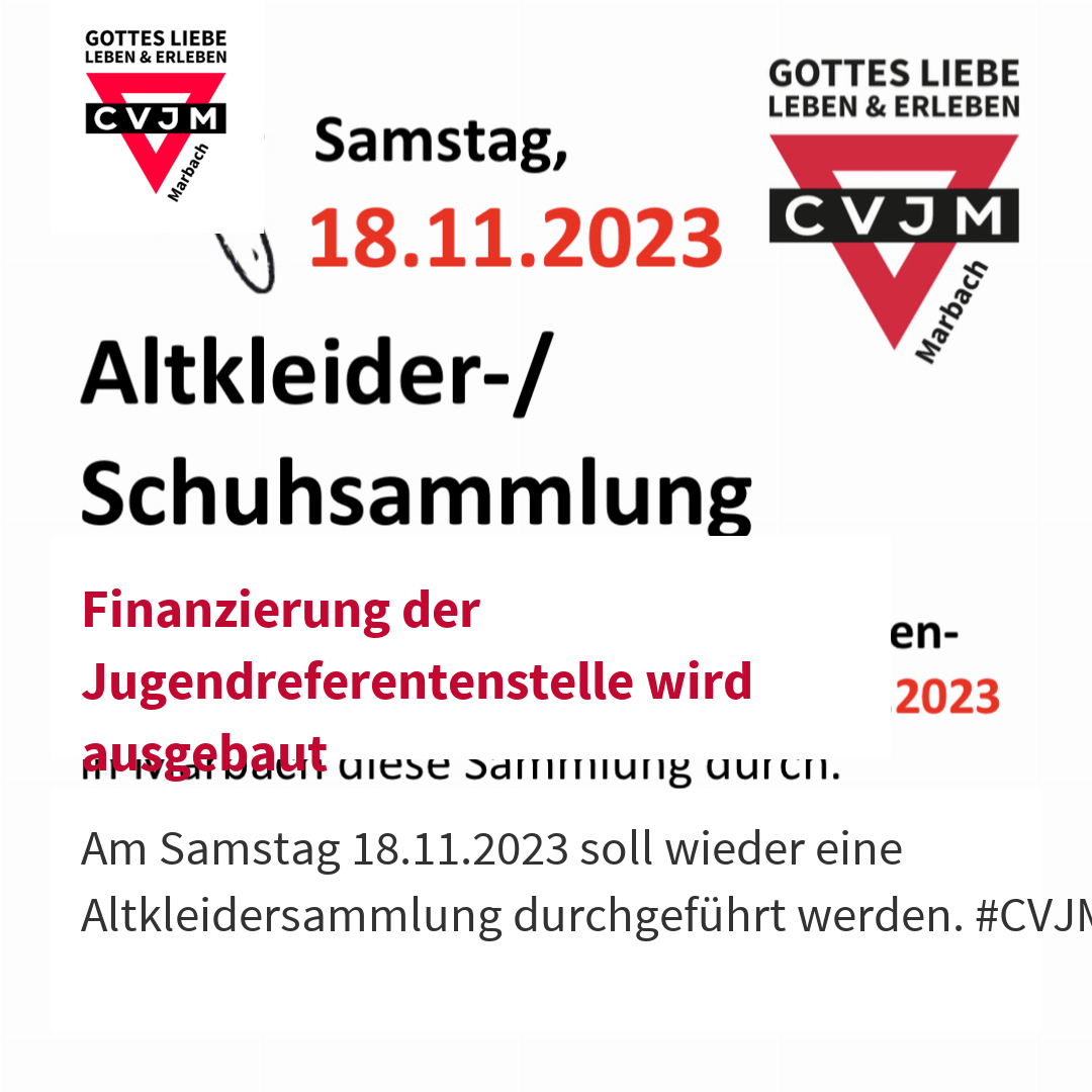 Dass die Anstellung eines Jugendreferenten im gemeinnützigen Bereich überhaupt möglich ist, verdankt der CVJM hauptsächlich dem Spendenaufkommen durch treue Dauerspender und der finanziellen Unterstützung durch die ev. Kirchengemeinde sowie der Durchführung des Flohmarkts. Bei früheren Aufrufen zu Sachspenden für Altkleidersammlungen und den Flohmarkt des CVJM, der im Sommer 2024 stattfinden soll, habe sich die Großzügigkeit der Marbacherinnen und Marbacher für den guten Zweck mehrfach bewiesen.