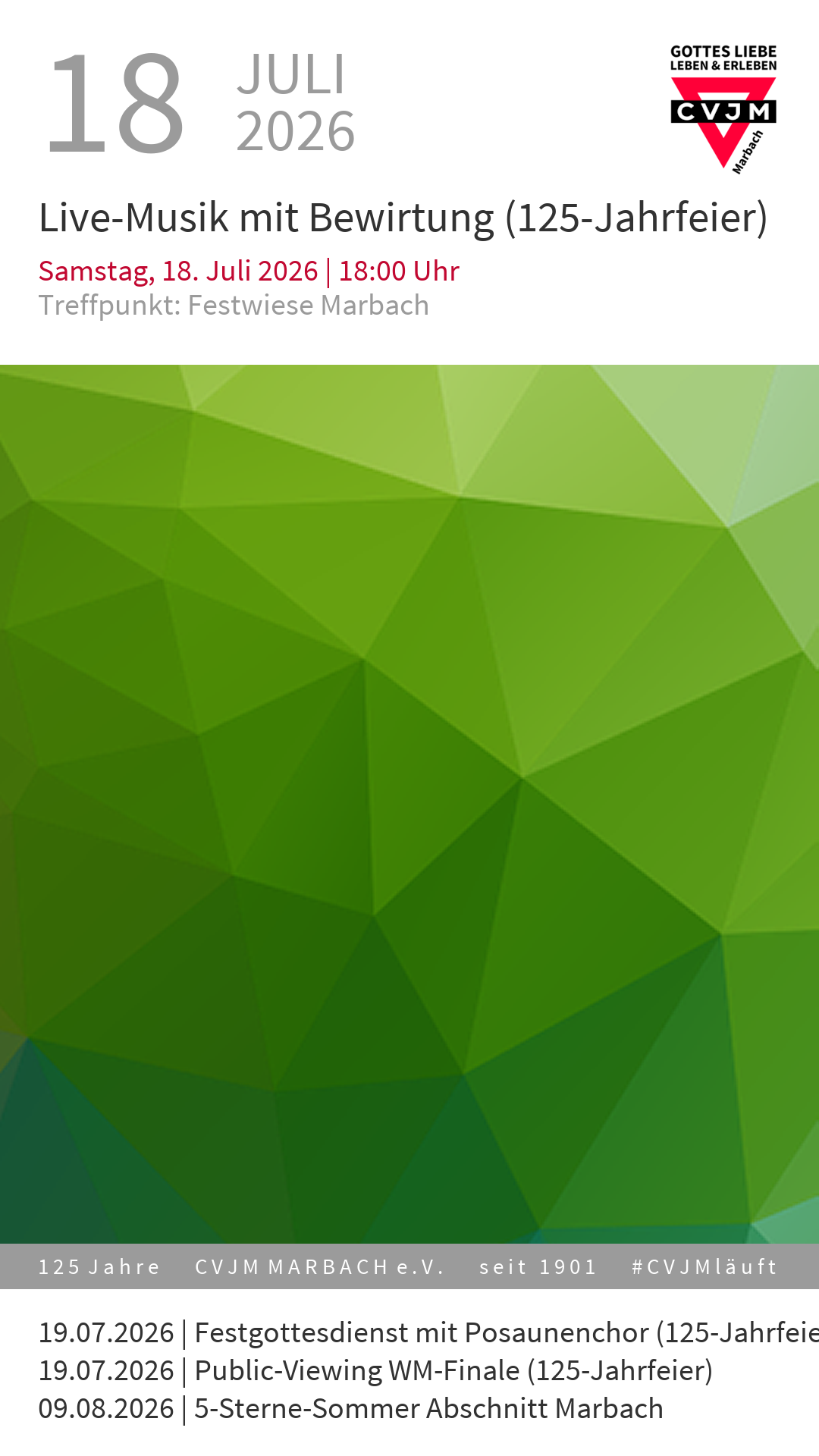 Vom 17. bis 19. Juli 2026 feiert der CVJM Marbach auf der Festwiese Marbach ein großes Jubiläums‑Festwochenende mit Gala‑Abend, Kinderprogramm, Live‑Musik, Festgottesdienst und Public Viewing. 04/2026
