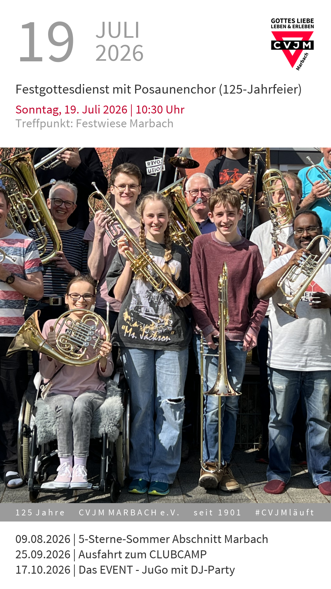 Im Rahmen des Jubiläumswochenendes lädt der CVJM zusammen mit der ev. Kirchengemeinde herzlich zum Festgottesdienst im Festzelt auf der Festwiese Marbach ein. Der CVJM Posaunenchor wird den Gottesdienst musikalisch begleiten. Im Anschluss gibts ein Kirchenkaffee.