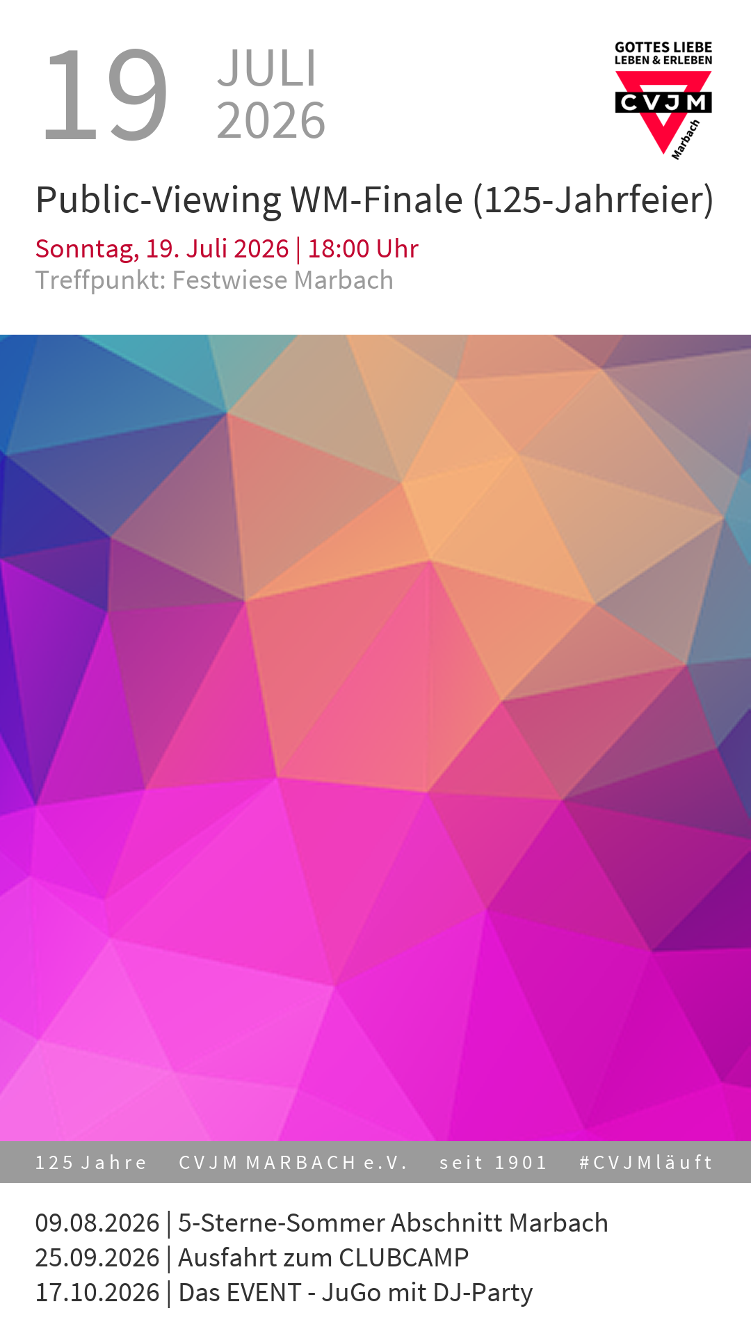 Vom 17. bis 19. Juli 2026 feiert der CVJM Marbach auf der Festwiese Marbach ein großes Jubiläums‑Festwochenende mit Gala‑Abend, Kinderprogramm, Live‑Musik, Festgottesdienst und Public Viewing. 04/2026