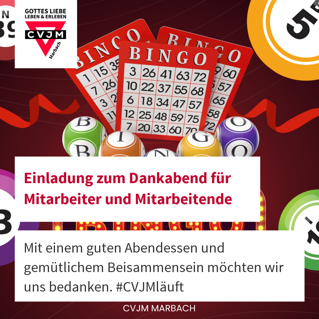 „Bingo!“ - Du bist ein wahrer Volltreffer unseres Vereinslebens und deshalb laden wir Dich in Beibehaltung einer schönen Tradition zum CVJM-Dankabend ein. Natürlich sind Partner und Kinder mit eingeladen. Ohne Deine tatkräftige Mitarbeit hätten wir unser vielfältiges Jahresprogramm nicht bewältigen können!