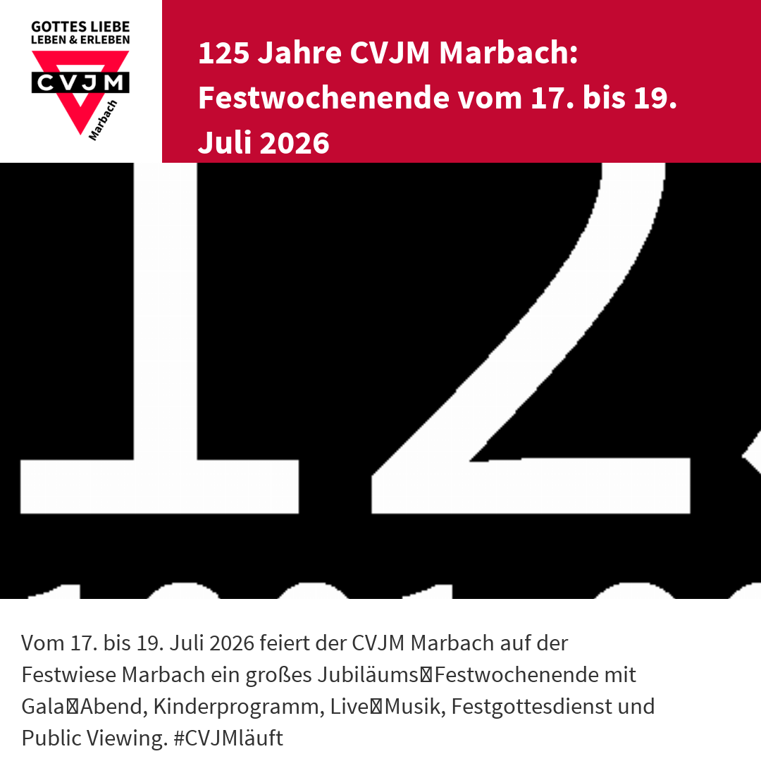 Im Jahr 2026 blickt der CVJM Marbach e.V. auf 125 Jahre Vereinsgeschichte zurück. Dieses besondere Jubiläum feiern wir mit einem großen Festwochenende vom Freitag, 17. Juli, bis Sonntag, 19. Juli 2026 auf der Festwiese Marbach / dem Bolzplatz Marbach.