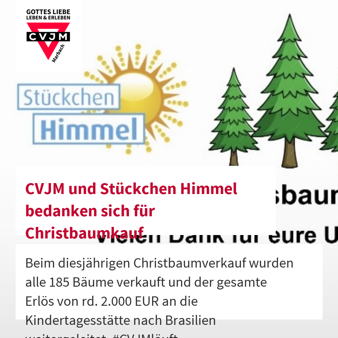 Der CVJM Marbach hat wieder erfolgreich den diesjährigen Christbaumverkauf zu Gunsten der Kindertagesstätte von Thomas Zettler in Brasilien geschafft. Alle 185 Bäume sowie Reisig wurden verkauft. Die Bewirtung durch den Jugendkreis mit Waffeln, Würste und Punsch war nicht nur lecker, sondern hat auch weitere Spenden in die Kasse für Stückchen Himmel gespült. Auch unser Eine-Welt-Lädle hat wieder fair gehandelte Kaffee, Honig, Schokolade und noch vieles mehr verkauft was nun wohl im Advent auf dem Tisch oder an Weihnachten unterm Baum landet. So kann Thomas Zettler und den 250 Kindern in Brasilien noch vor Weihnachten rund 2.000€ als Gewinn überwiesen werden. Da Thomas mit Inflation und etwas Spendenrückgang kämpft ist das eine gute Finanzspritze für ihn. Der CVJM Marbach und Stückchen Himmel bedankt sich bei allen Käufern, Spendern, Helfern, Verkäufern und wünscht allen ein gesegnetes Weihnachten.