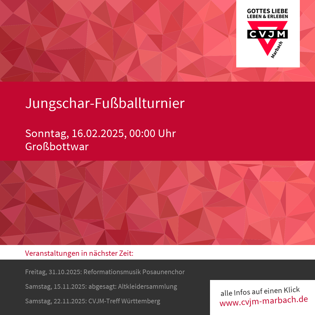 » zum VeranstaltungskalenderJungschar-Fußballturnier am Sonntag, den 16.02.2025 um 00:00 Uhr. Die Veranstaltung findet hier statt: Großbottwar.