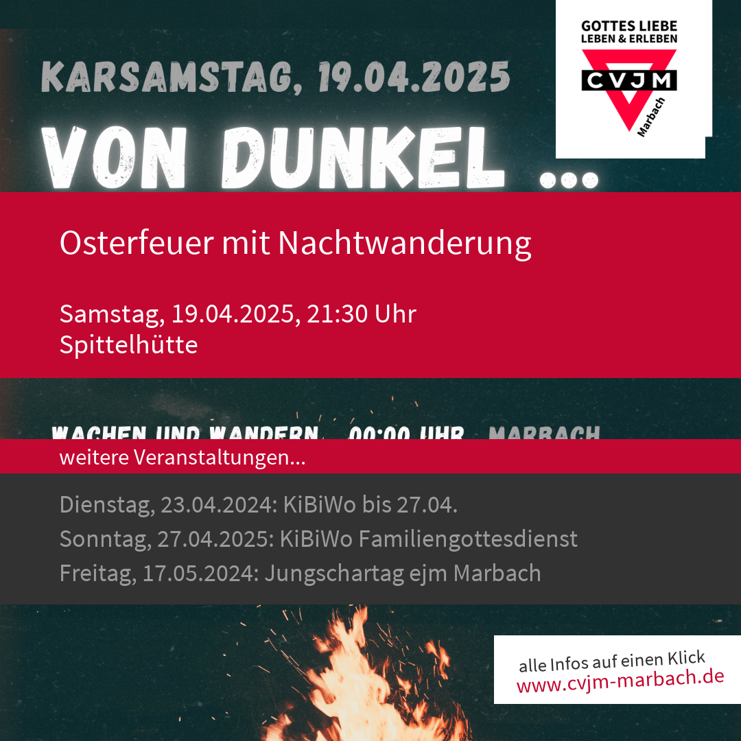 Osterfeuer mit Gedanken des Petrus und anschließender Nachtwanderung: Wachen und Wandern mit stündlichem Impuls. Du hast Lust? Dann melde Dich bei Nico oder über die Interessenanmeldung. Keine Lust, die Nacht durchgängig zu wandern? Nach dem Osterfeuer darf man auch guten Gewissens heimgehen oder die Wanderung eigenständig verkürzen.