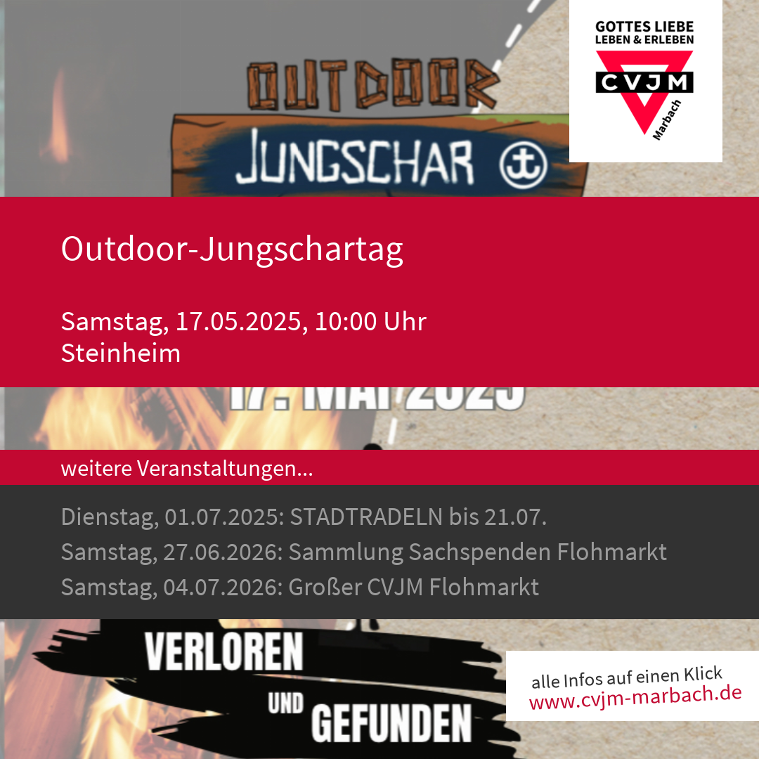 Anmeldung über Interessensanmeldung bis 27.4., im Anschluss senden wir weitere Informationen zu. Thema VERLOREN UND GEFUNDEN - DIE GROSSE HEIMKEHR. Für Jungs und Mädchen zwischen 6 und 12 Jahren. Am Samstag, den 17. Mai 2025 von 10-16 Uhr wird es rund um die Kaisersberghütte spannend! Kinder aus dem ganzen Kirchenbezirk Marbach werden zusammen ein großes Abenteuer erleben. Bist du bereit für ein unvergessliches Abenteuer? Dann komm zum Outdoor Jungschartag! Feuer machen, schnitzen, Lager bauen, spielen – gemeinsam mit deiner Jungschargruppe erlebst du spannende Erlebnisse in der Natur. Doch das ist nicht alles: Eine Geschichte voller Verlust, Neuanfang und Heimkehr erwartet dich. Sei dabei und finde heraus, was dahintersteckt!
