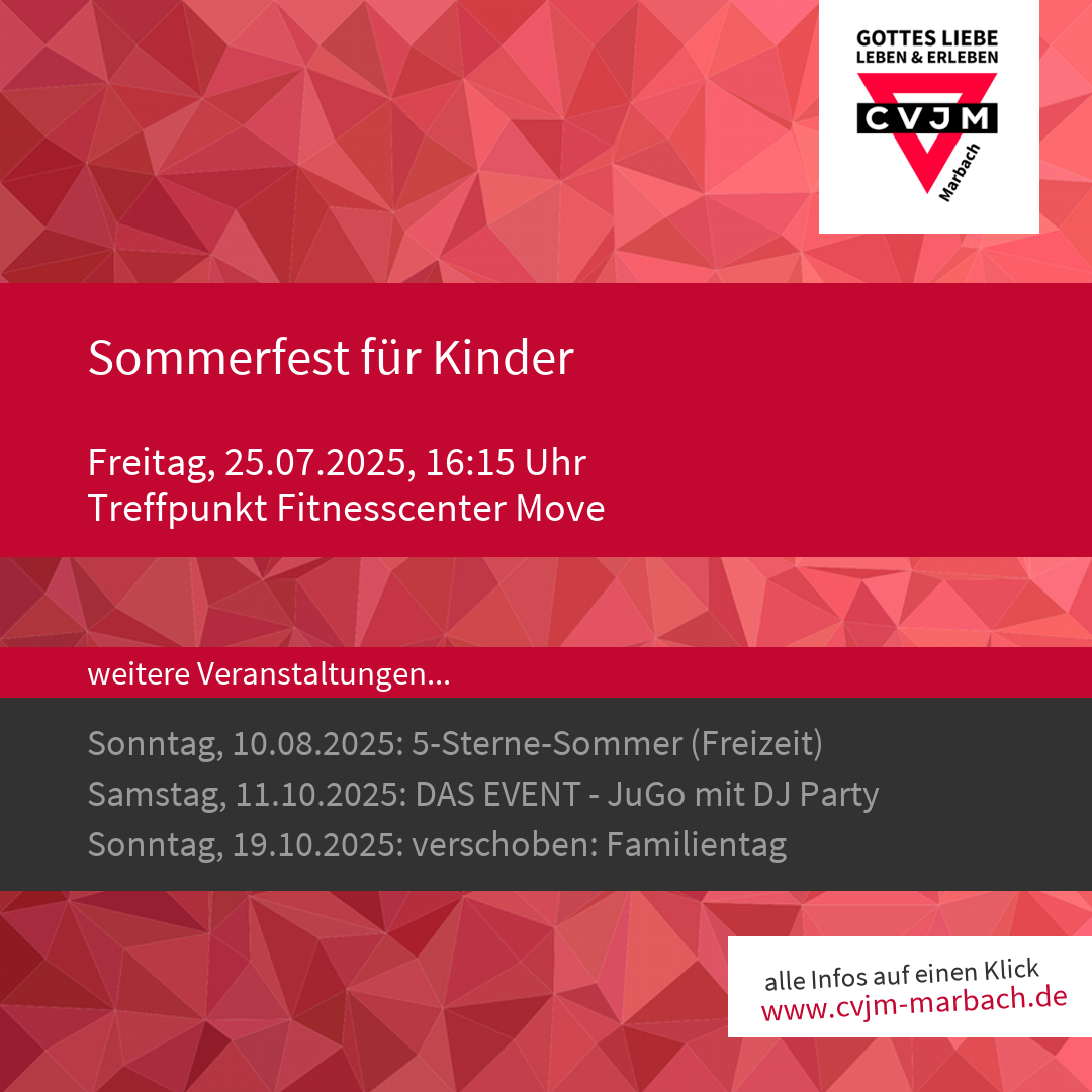 Am letzten Freitag vor den Sommerferien (25.07.) machen wir wieder unseren Open-Air-Sommerabschluss. Los gehts für die 5 bis 12-jährigen um 16:30 Uhr in der Kirchenweinbergstraße beim Fitnesscenter Move zur Kurzwanderung auf die Spittelhütte, wo Wasserspiele auf die Kinder warten. Ende ist um 18:15 Uhr wieder am Treffpunkt. Bei akut schlechtem Wetter wird das Sommerfest ins Martin-Luther-Haus verlegt. Wir freuen uns auf euch!